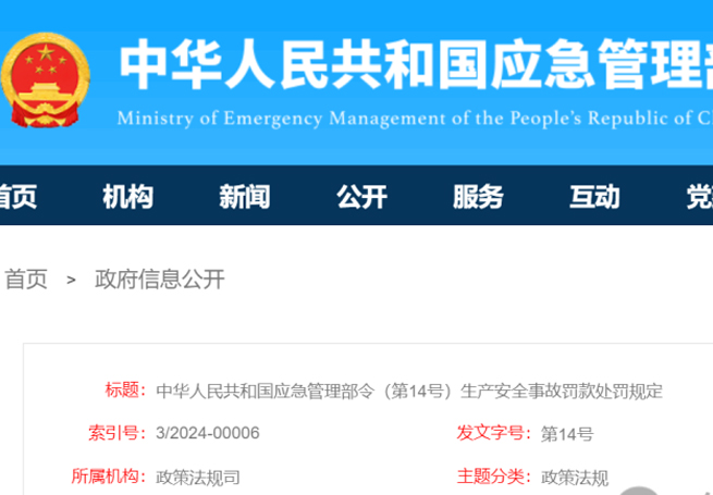 第14號生產安全事故罰款處罰規定中華人民共和國應急管理部令第14號《生產安全事故罰款處罰規定》已經2023年12月25日應急管理部第32次部務會議審議通過,現予公布,自2024年3月1日起施行。部長 王祥喜2024年1月10日...