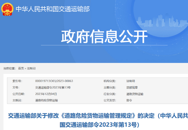 關于修改和廢止部分行政法規的決定近日,國務院發布《關于修改和廢止部分行政法規的決定》(國務院令第764號,以下簡稱《決定》),對《中華人民共和國道路運輸條例》作出修改。為落實《決定》要求,交通運輸部對《道路危險貨物運輸管理規定》進行了相應修改,取消了“對道路危險貨物運輸企業或者單...