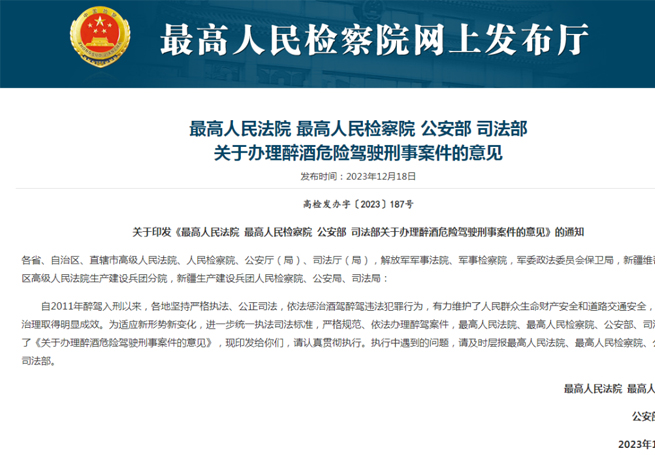 12月18日,公安部、司法部、最高人民法院、最高人民檢察院聯合發布《關于辦理醉酒危險駕駛刑事案件的意見》。《意見》根據案件的具體情節,該寬則寬,當嚴則嚴,罰當其罪,危險品運輸如有相關違規行為,將從重處罰,將于2023年12月28日起施行。劃重點1、新國標將血液中乙醇的含量分為三個...
