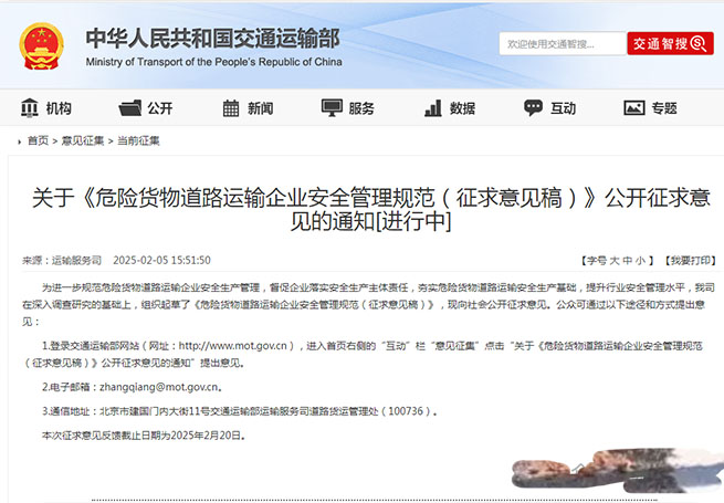 為進一步規范危險貨物道路運輸企業安全生產管理,督促企業落實安全生產主體責任,夯實危險貨物道路運輸安全生產基礎,提升行業安全管理水平,近日,交通運輸部運輸服務司在深入調查研究的基礎上,組織起草了《危險貨物道路運輸企業安全管理規范(征求意見稿)》,現向社會公開征求意見。根據當前危險貨...
