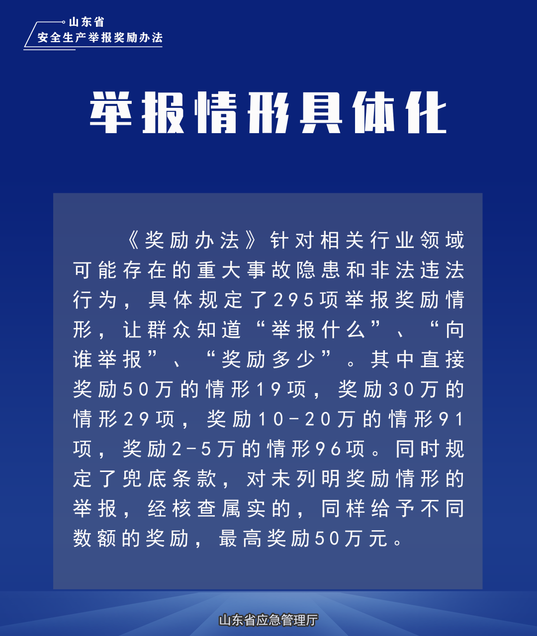 為杜(du)絕瞞(man)報事故,舉報(bao)隱(yin)患和違(wei)法最(zui)高獎(jiang)勵50萬元(yuan)。各(ge)位工友,心動嗎?山東省應急廳聯(lian)合省財政廳等(deng)9個部(bu)門制定了《山東省安全生產舉報獎(jiang)勵辦(ban)法》,對舉報(bao)核實的實名舉報(bao)人分檔(dang)給予50萬(wan)、30萬(wan)、20萬(wan)、10萬(wan)等不同額度(du)的現(xian)金重獎。️