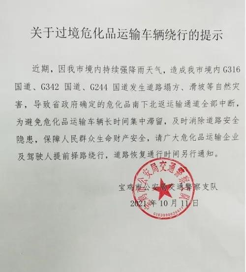 近期,因寶(bao)雞市境內(nei)持(chi)續強降雨天氣(qi),造成寶(bao)雞市境內(nei)G316國(guo)(guo)道、G342國(guo)(guo)道、G244國(guo)(guo)道發生(sheng)(sheng)道路塌方、滑坡等自然災害(hai),導致省政府確定的危化(hua)品南下北返運輸通道全部中(zhong)斷,為(wei)避免(mian)危化(hua)品運輸車輛長(chang)時(shi)間集(ji)中(zhong)滯(zhi)留,及時(shi)消除道路安(an)(an)全隱患,保障人民群眾生(sheng)(sheng)命財產安(an)(an)全。 請(qing)廣大危化品運輸(shu)企業(ye)及駕駛人提前(qian)擇(ze)路繞(rao)行,道(dao)路恢復通行時間另(ling)行通知。 陜(shan)西其他(ta)限行措施: G85銀昆高速寶雞南互通立(li)交至田壩樞(shu)紐立(li)交段(duan)限行 為(wei)進一步加強(qiang)危化品(pin)道路運輸(shu)安(an)全(quan)(quan)管(guan)理,防范化解交(jiao)通安(an)全(quan)(quan)風險隱患,保障人(ren)(ren)民群眾生命、財產安(an)全(quan)(quan),全(quan)(quan)力預防危化品(pin)運輸(shu)車輛道路交(jiao)通事故(gu),依據《中華人(ren)(ren)民道路交(jiao)通安(an)全(quan)(quan)法》《危險貨物道路運輸(shu)安(an)全(quan)(quan)管(guan)理辦(ban)法》等有關法律、行政法規。結合道路實(shi)際(ji),經(jing)研究決定,禁止(zhi)危化品(pin)運輸(shu)車輛通行G85銀昆高速(su)寶雞南互通立交(jiao)(K601+000)至田壩樞紐立交(jiao)(K649+100)段道路(隧道群)。現將(jiang)有關事項通告如下: 一、限(xian)行車輛 危化品運輸車輛。 二、限行路(lu)段 G85銀昆高(gao)速寶雞(ji)南互通立交(K601+000)至田(tian)壩樞紐立交(K649+100)段道(dao)路(lu)。 三(san)、限行時間 10月8日起全天24小時(shi)禁(jin)止危化品(pin)運輸車輛通行。 四、繞(rao)行路(lu)線 (一)連霍高(gao)(gao)速(su)甘肅天水和楊凌(ling)方向及(ji)G85銀昆高(gao)(gao)速(su)平涼方向來車,經潘(pan)家灣樞(shu)紐立(li)交駛(shi)入G85銀昆高(gao)(gao)速(su)至寶雞南出(chu)口駛(shi)出(chu),經高(gao)(gao)速(su)公路引線駛(shi)入S219省(sheng)道(dao)。 (二)漢(han)中方向來(lai)車,經G244國道潘太公路(lu)通(tong)行(xing)、禁止(zhi)駛入G85銀昆高速(su)。 (三(san))過境(jing)危化(hua)品運(yun)輸車輛嚴禁駛入寶雞市區道(dao)路。 陜西殘(can)特奧會期間限行 殘(can)特奧會(hui)賽(sai)事期間(jian)對陜西省境(jing)內危化品(pin)運輸車輛(liang)實施交通(tong)管制,具體(ti)通(tong)告如下: 劇毒化學品車輛 2021年10月18日00:00——30日24:00 全省境內禁止劇毒化學品運輸(shu)車輛通行。 危(wei)化品運輸車輛 2021年10月20日(ri)00:00——24日(ri)24:00 2021年10月27日00:00——30日24:00 全省境內禁止危化品運輸車輛通行。