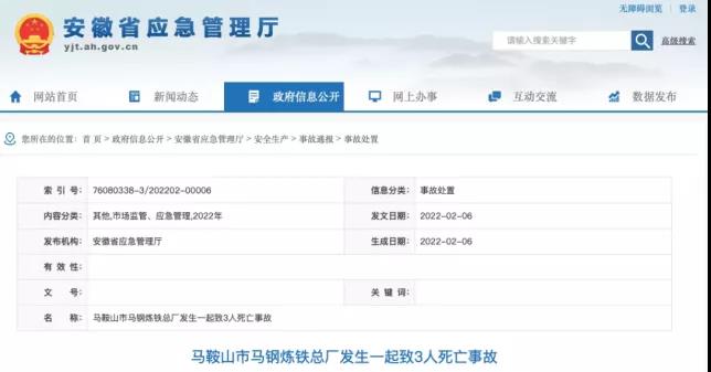 熱鬧(nao)的春節假期結束了,令人(ren)沒想到的是假期最(zui)后一天,安(an)徽一煉鐵廠突發事故(gu),致4人不幸遇難。 復工(gong)安全(quan)千(qian)萬不能兒戲! 據(ju)安(an)徽省(sheng)應急管理廳通報,2月6日上午,安(an)徽馬(ma)鞍(an)山市馬(ma)鋼煉鐵總廠一料倉發生事故,致4人(ren)不幸遇難(nan)、1人(ren)受傷(shang)。 2月6日上午10時(shi)20分(fen)左右,馬(ma)鋼煉鐵總廠區域內一料倉(cang)本(ben)(ben)體(ti)漏灰,6名工(gong)作(zuo)(zuo)人員(yuan)(yuan)進行搶(qiang)修作(zuo)(zuo)業時(shi),灰斗(dou)本(ben)(ben)體(ti)突(tu)然開裂,大量脫硫灰冒出。工(gong)作(zuo)(zuo)人員(yuan)(yuan)被從四樓(lou)平臺沖至(zhi)二(er)樓(lou)平臺,4人送醫搶(qiang)救(jiu),其(qi)中3人搶(qiang)救(jiu)無(wu)效死亡,1人生命體(ti)征平穩;另1人手部(bu)輕微灼傷;1人被掩埋,17時(shi)被搜救(jiu)出已無(wu)生命體(ti)征。 目前,事故原(yuan)因正在調查分(fen)析中。