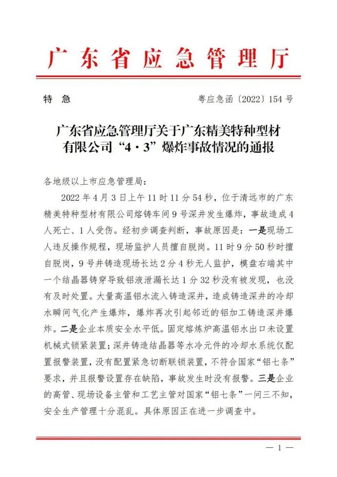 4月3日上午,廣東清遠某特種型材有限公司熔鑄二號車間9號鑄造井發生爆炸事故。事故造成4人死亡、1人重傷,廠房嚴重損毀。 監(jian)控視(shi)頻顯示(shi),爆(bao)炸現(xian)場升起數(shu)米高(gao)的“蘑(mo)菇(gu)云”。 4月(yue)5日(ri),清(qing)(qing)遠(yuan)市清(qing)(qing)城(cheng)區應急管(guan)理局通報,經(jing)現場初(chu)步(bu)判斷,直接原因為:鋁棒在拉鑄過程(cheng)中,鋁水泄漏到冷卻水池內導致事(shi)故(gu)發生(sheng)。 事故(gu)通報顯示,具體事故(gu)原因初步總結(jie)為: 一是(shi)現場工人違反(fan)操(cao)作規程,現場監護人員擅自脫(tuo)崗(gang)。 二是企業本質安全(quan)水平低。 三(san)是企業的高(gao)管(guan)、現場設(she)備主管(guan)和工(gong)藝(yi)主管(guan)對國家“鋁七條”一問三(san)不知(zhi),安全生產管(guan)理(li)十分混(hun)亂。 有關善(shan)后工作(zuo)正在進行中,清遠已(yi)成立事故調查(cha)組(zu),正開展(zhan)事故調查(cha)處理工作(zuo)。
