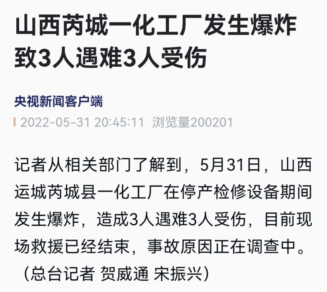 2022年(nian)5月31日,山西運城芮城縣一化工廠在(zai)停產檢修設備期間(jian)發生爆(bao)炸,造成3人遇難3人受傷。 ▲來(lai)源(yuan):央視新聞客戶端 事故發生在芮城(cheng)縣工業(ye)東街附(fu)(fu)近(jin),周邊(bian)一工廠員工稱,事發時間為下午2點多,爆炸的聲音特別大(da)。他3點多出(chu)門時,看到工業(ye)東街附(fu)(fu)近(jin)被(bei)封鎖起來,有工作(zuo)人員駐守(shou),消防也在現場(chang)。 事發地(di)300米(mi)外一(yi)家賓(bin)館的(de)房(fang)客稱,事發時她(ta)還在房(fang)間休息,突然被一(yi)聲巨(ju)響(xiang)驚(jing)醒(xing),誤(wu)以為(wei)是地(di)震。透過(guo)窗戶,他(ta)遠遠看(kan)見(jian)附近工廠在冒煙,仔細(xi)一(yi)看(kan)窗戶玻璃上有(you)裂紋。 目前現場救援已經結束,事故原因正在調查中,請繼續關注官方報道。