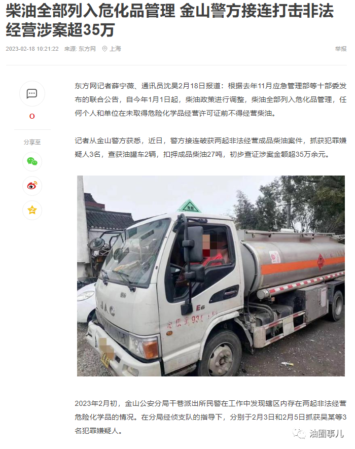 案(an)例一:近日,長沙市天心區應急管理局接到群眾舉報,在暮云街道蓮河村蓮河加油站正后面100米處一板房內,儲存了危險化學品。該局立即聯合組織公安、街道等部門上門核實,發現龔某某為節約成本,在自建板房油罐內儲存2.88噸柴油,供自家車隊使用。臨邊就是中石化蓮河加油站,一旦出現泄漏事故,易造成人員傷害和環境傷害,存在重大的安全隱患。天心區應急管理局當即對危險化學品進行了扣押,消除安全隱患。 目前,天心區(qu)應急管(guan)(guan)理(li)局已經對龔某(mou)某(mou)立案調查,龔某(mou)某(mou)未將危險(xian)(xian)化學品儲(chu)存(cun)在專用倉庫內,違反了《危險(xian)(xian)化學品安(an)(an)全(quan)管(guan)(guan)理(li)條(tiao)例(li)》相關(guan)(guan)規定,執法人員依(yi)據《危險(xian)(xian)化學品安(an)(an)全(quan)管(guan)(guan)理(li)條(tiao)例(li)》和《安(an)(an)全(quan)生產行政(zheng)執法與刑(xing)事司法銜接工作(zuo)辦法》(應急〔2019〕54 號)相關(guan)(guan)規定,對龔某(mou)某(mou)作(zuo)出罰款60000元(yuan)的行政(zheng)處罰,并移交公(gong)安(an)(an)部門進行行刑(xing)銜接。 案例二(er):3月3日下午,根據群眾舉報,長沙市開福區應急管理局聯合青竹湖街道對湖南某公司開展危險化學品“打非治違”執法檢查行動。該公司位于新港路80號,現場設置了地下儲油罐1個、加油機1臺。公司負責人表示,儲罐內儲存的0號車用柴油主要用于公司內部車輛加油使用。執法人員檢查發現地下儲罐全部浸泡水中,銹蝕嚴重,且未采取任何安全防范措施,存在巨大安全隱患。 該公(gong)司涉嫌違反《危險(xian)化(hua)學(xue)品(pin)安全(quan)管(guan)理條例》第二十四條第一(yi)款“危險(xian)化(hua)學(xue)品(pin)應當儲存(cun)(cun)在(zai)專(zhuan)用倉(cang)庫、專(zhuan)用場(chang)地(di)(di)或(huo)者專(zhuan)用儲存(cun)(cun)室(以下(xia)統(tong) 稱(cheng)專(zhuan)用倉(cang)庫)內,并由專(zhuan)人(ren)負責(ze)管(guan)理的(de)規(gui)(gui)定”。執法(fa)人(ren)員依法(fa)對該地(di)(di)下(xia)儲油罐進(jin)行查封,扣押柴(chai)油4.6噸。目前案(an)件正(zheng)在(zai)進(jin)一(yi)步(bu)調查中。2023年1月1日起,所(suo)有柴(chai)油列為(wei)《危險(xian)化(hua)學(xue)品(pin)目錄》,不再(zai)區分(fen)閃點。為(wei)打(da)好安全(quan)生產攻堅(jian)仗,開(kai)福(fu)區危化(hua)煙花工(gong)(gong)貿(mao)專(zhuan)委會深入推進(jin)柴(chai)油專(zhuan)項整治工(gong)(gong)作,組織(zhi)各街道、各部門全(quan)面(mian)摸排,特(te)別是(shi)物流運輸企業、渣土公(gong)司、攪拌站(zhan)、建設工(gong)(gong)地(di)(di)、廢(fei)鐵(tie)站(zhan)等用油量較(jiao)大的(de)單位,嚴禁違規(gui)(gui)設置露天罐、埋地(di)(di)罐等非法(fa)儲油設施;交(jiao)警、交(jiao)通部門將加大對非法(fa)改裝廂式貨車、面(mian)包車非法(fa)運輸柴(chai)油的(de)打(da)擊(ji)力(li)度;公(gong)安機關(guan)積極配(pei)合(he)辦理行刑銜接案(an)件。 案例三:2023年2月初,上海金山公安分局干巷派出所民警在工作中發現轄區內存在兩起非法經營危險化學品的情況。在分局經偵支隊的指導下,分別于2月3日和2月5日抓獲吳某等3名犯罪嫌疑人。經查,犯罪嫌疑人吳某等3人在已申報但還未取得危險化學品經營許可證的情況下,長期從事柴油銷售,他們從正規渠道以“批發價”購入柴油,銷售的柴油主要用于工地施工設備以及農場農用機械等,至案發已非法銷售柴油50余噸,涉案金額超35萬元。 目(mu)前,犯罪(zui)嫌(xian)疑人吳某(mou)、尹(yin)某(mou)、艾某(mou)3人因涉嫌(xian)非法經(jing)營罪(zui)被公安(an)機(ji)關依法采取刑事強制(zhi)措(cuo)施,案件正在進一步審理中(zhong)。根據(ju)網絡上的(de)政策解讀,柴(chai)油全部列入(ru)危(wei)化(hua)品管理后(hou),將嚴厲打(da)擊一些個人或(huo)企(qi)業(ye)利用內(nei)部自用加(jia)(jia)油站(zhan)的(de)名(ming)義(比(bi)如物流公司(si)內(nei)部車輛加(jia)(jia)油)來打(da)擦(ca)邊球進行柴(chai)油對外經(jing)營或(huo)貿易的(de)行為,柴(chai)油納入(ru)危(wei)化(hua)品管理后(hou),若無證經(jing)營或(huo)儲(chu)存(cun),將面臨刑法的(de)危(wei)險作(zuo)業(ye)罪(zui)、非法經(jing)營罪(zui)的(de)責任追究(jiu)。此外,按照治安(an)管理處罰法相關要求,對加(jia)(jia)油站(zhan)對外銷(xiao)售打(da)桶或(huo)散裝柴(chai)油有可能(neng)更(geng)加(jia)(jia)嚴格,對于(yu)偷盜(dao)柴(chai)油的(de)行為,處罰會更(geng)加(jia)(jia)嚴重。 危化品介紹 2022年11月7日,應急管理部等10部門發布關于調整《危險(xian)化(hua)學(xue)品(pin)目錄(2015版)》的公告,將“1674柴油[閉杯閃點≤60℃]”調整為“1674柴油”,新規于2023年1月1日起施行。危險化學品,是指具有毒害、腐蝕、爆炸、燃燒、助燃等性質,對人體、設施、環境具有危害的劇毒化學品和其他化學品。一旦儲存運輸不當,將會嚴重危害影響人民的生命安全和環境安全。危險化學品對于儲存場地有特殊的要求,應與其他貨物分開儲存,儲存在專用倉庫內,并有專人負責管理。 溫馨提醒 企業在儲存和使用危險化學品時,要對危險化學品進行管理,采取安全措施。危險化學品(pin)必(bi)須(xu)存放到(dao)專(zhuan)用倉庫,倉庫應建在企業單位區域邊緣且保證有安全的防火間距。倉庫必須具有良好的通風、隔熱條件,配備降溫、防潮、防汛、防雷等設施。倉庫的設施需要定期由專人檢查登記。倉庫內應安裝自動監測和火災報警系統。倉庫內設施皆需要防爆功