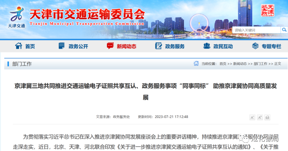 日(ri)前(qian),北(bei)京(jing)市、天津市、河北(bei)省聯合印發《關于進一步(bu)推進京(jing)津冀(ji)交(jiao)通(tong)(tong)運輸(shu)電子(zi)(zi)證(zheng)照共享互認(ren)的通(tong)(tong)知(zhi)》《關于推出京(jing)津冀(ji)交(jiao)通(tong)(tong)運輸(shu)領域首批“同事同標(biao)”事項(xiang)的通(tong)(tong)知(zhi)》。目(mu)前(qian),經三地(di)(di)核(he)發的五大類電子(zi)(zi)證(zheng)照已實現三地(di)(di)互認(ren): 1、道路運輸經營許可證 2、道路運輸證 3、道路運輸(shu)從業(ye)人員從業(ye)資格證(zheng) 4、道路危險貨物運輸許(xu)可證 5、放(fang)射性物品道路運輸(shu)許(xu)可(ke)證