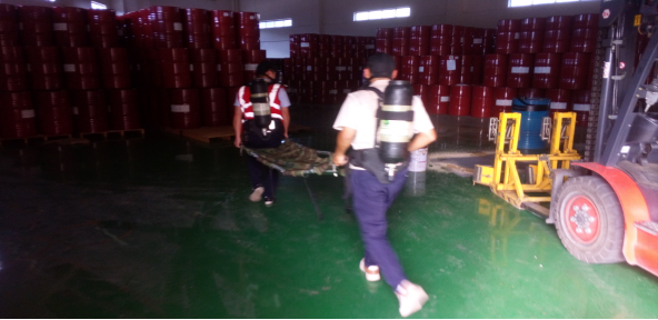 本次演練(lian)(lian)屬公(gong)(gong)司(si)級重大危險源(yuan)專項應(ying)(ying)急救(jiu)援演練(lian)(lian),演練(lian)(lian)內容包括:泄(xie)露現(xian)場初期處置(zhi)、應(ying)(ying)急報(bao)警(jing)、應(ying)(ying)急疏(shu)散(san)及(ji)(ji)警(jing)戒、泄(xie)露源(yuan)堵漏、傷員(yuan)(yuan)(yuan)救(jiu)治及(ji)(ji)搜(sou)救(jiu)、事(shi)故(gu)現(xian)場的清理及(ji)(ji)保(bao)護。參與人(ren)(ren)員(yuan)(yuan)(yuan)有倉儲(chu)人(ren)(ren)員(yuan)(yuan)(yuan)、安環部人(ren)(ren)員(yuan)(yuan)(yuan)及(ji)(ji)辦公(gong)(gong)室(shi)各部門后勤人(ren)(ren)員(yuan)(yuan)(yuan)共39個人(ren)(ren),分(fen)成堵漏處置(zhi)組(zu)、工藝組(zu)、事(shi)故(gu)洗消組(zu)、事(shi)故(gu)監測組(zu)、消控組(zu)、搜(sou)救(jiu)組(zu)、醫療救(jiu)護及(ji)(ji)后勤保(bao)障組(zu)、安全警(jing)戒及(ji)(ji)疏(shu)散(san)組(zu)等8個應(ying)(ying)急救(jiu)援組(zu)。整個演練(lian)(lian)歷時25分(fen)鐘。演練(lian)(lian)圖片(pian)見附(fu)圖。