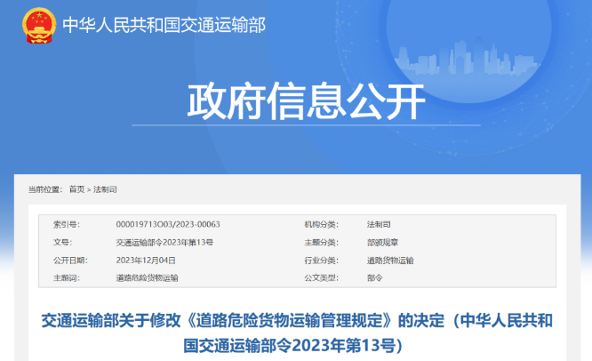 近(jin)日(ri),國(guo)務(wu)院發布《關(guan)于修改和廢止部分行政法規(gui)的(de)決定(ding)》(國(guo)務(wu)院令第(di)764號,以下簡稱《決定(ding)》),對《中華人民共和國(guo)道路運輸條例》作出修改。 為落實《決定》要求(qiu),交通運(yun)輸(shu)部(bu)對《道路危險貨物運(yun)輸(shu)管理規定》進行了相(xiang)應修改,取(qu)消了“對道路危險貨物運(yun)輸(shu)企業或者單(dan)位不(bu)按照規定隨車攜帶(dai)道路運(yun)輸(shu)證行為的(de)罰款(kuan)”。 此外,依(yi)據(ju)國家機構(gou)改革(ge)部(bu)署,對(dui)部(bu)分機構(gou)名(ming)稱進(jin)行了相應修改;依(yi)據(ju)近(jin)兩(liang)(liang)年新頒布實施(shi)的(de)《中(zhong)華人民共和(he)國安(an)全生產法》,對(dui)處罰規定進(jin)行了梳理和(he)調整,以與(yu)上位(wei)法保持(chi)一(yi)致;根(gen)據(ju)近(jin)兩(liang)(liang)年標(biao)準(zhun)修改、廢止(zhi)情況(kuang),對(dui)引用的(de)標(biao)準(zhun)名(ming)稱進(jin)行了相應更新。 詳情如下: 一(yi)、將第三條中的“《危(wei)險貨物品名表(biao)》(GB 12268)”、第四(si)條中的“《危(wei)險貨物分類和(he)品名編號》(GB 6944)”“《危(wei)險貨物品名表(biao)》(GB 12268)”“《危(wei)險貨物運(yun)輸包裝(zhuang)通用技術(shu)條件》(GB 12463)”修(xiu)改為(wei)“《危(wei)險貨物道(dao)路運(yun)輸規則》(JT/T 617)”。 二(er)、將第七(qi)條第二(er)款(kuan)修改為:“縣(xian)級以上地(di)方人(ren)民政府交通(tong)運輸主(zhu)管部門(以下簡稱交通(tong)運輸主(zhu)管部門)負責本(ben)行政區域(yu)的(de)道路危險貨物運輸管理工(gong)作(zuo)”;刪去第三款(kuan)。 三、將第(di)九條(tiao)(tiao)、第(di)十一(yi)條(tiao)(tiao)中的“安全生產監督(du)管理(li)部門”修改為“應(ying)急(ji)管理(li)部門”。 四、將第十條中的(de)“工商行政管理機關(guan)”修改為(wei)“市場(chang)監(jian)督管理部門(men)”。 五、刪去第(di)八條(tiao)第(di)一項(xiang)第(di)6目中的“質(zhi)量檢(jian)驗部(bu)門(men)”、第(di)二十三(san)條(tiao)、第(di)二十四條(tiao)第(di)三(san)款中的“質(zhi)量檢(jian)驗部(bu)門(men)出具的”。 六、將第(di)三十(shi)六條(tiao)、第(di)四十(shi)四條(tiao)中的“《汽車運(yun)(yun)輸(shu)危(wei)(wei)險貨物(wu)規則》(JT 617)”“《汽車運(yun)(yun)輸(shu)、裝卸(xie)危(wei)(wei)險貨物(wu)作業規程(cheng)》(JT 618)”修改為“《危(wei)(wei)險貨物(wu)道(dao)路運(yun)(yun)輸(shu)規則》(JT/T 617)”。 七、第四十八條(tiao)改為第四十七條(tiao),將其(qi)中(zhong)的“安全生(sheng)產監督管(guan)理部(bu)門和(he)環境保護(hu)、衛生(sheng)主管(guan)部(bu)門”修改為“應急管(guan)理部(bu)門和(he)生(sheng)態環境、衛生(sheng)健康主管(guan)部(bu)門”。 八、第五十六條(tiao)改(gai)為(wei)(wei)第五十五條(tiao),將其中的“有違法所(suo)得(de)的”修改(gai)為(wei)(wei)“違法所(suo)得(de)超過2萬元的”。 九、刪去第五(wu)十九條(tiao)。 十(shi)(shi)、第六十(shi)(shi)一條改(gai)為第五十(shi)(shi)九條,修改(gai)為:“違反本(ben)規定,道(dao)路危(wei)險(xian)貨物運輸(shu)(shu)企(qi)業(ye)或者單位(wei)未配備專職(zhi)安全(quan)(quan)管理人員的,由(you)交通運輸(shu)(shu)主管部門依照(zhao)《中華人民共和國安全(quan)(quan)生產(chan)法》的規定進行處(chu)罰。” 十一、將(jiang)“道(dao)路運輸管(guan)理(li)機構(gou)(gou)”“道(dao)路危險貨物運輸管(guan)理(li)機構(gou)(gou)”“縣級以上(shang)道(dao)路運輸管(guan)理(li)機構(gou)(gou)”統一修改為(wei)“交通運輸主管(guan)部門”。 條文序(xu)號(hao)和個(ge)別文字作相應(ying)修改。 本決定自(zi)公布之日起施行。 《道路危險貨(huo)物運輸管理規定(ding)》根據本決定(ding)作相應修(xiu)正,重新公(gong)布。