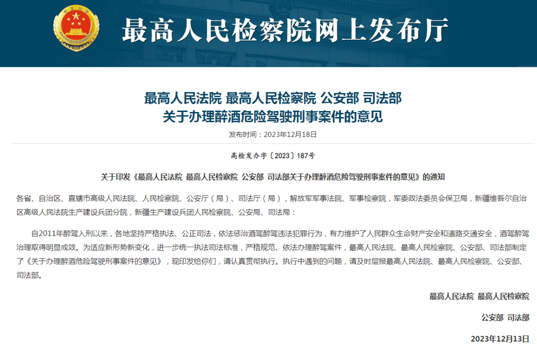 12月18日,公(gong)安部(bu)、司法部(bu)、最(zui)高人民法院、最(zui)高人民檢察院聯合(he)發(fa)布《關于辦理醉酒危險駕駛(shi)刑(xing)事案件的意見》。