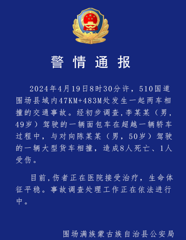 4月19日8時30分許,510國道圍場(chang)滿族蒙古族自治(zhi)縣縣域(yu)內47KM+483M 處發生一起兩(liang)車相(xiang)撞的(de)(de)交通事故。經初步(bu)調查(cha)(cha),李某某(男,49歲)駕駛的(de)(de)一輛面包車在超越一輛轎車過程中,與對向陳某某(男,50歲)駕駛的(de)(de)一輛大型貨(huo)車相(xiang)撞,造成8人(ren)死亡(wang)、1人(ren)受(shou)傷(shang)(shang)。目前,傷(shang)(shang)者正在醫院接受(shou)治(zhi)療,生命體征平(ping)穩(wen)。事故調查(cha)(cha)處理工作正在依法(fa)進行中。