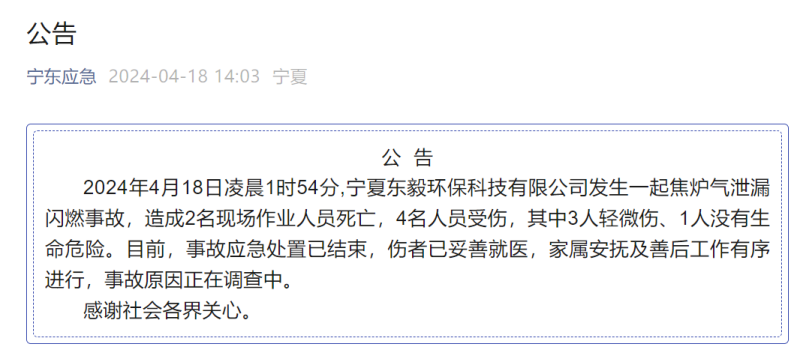2024年4月18日(ri)凌晨1時54分,寧夏(xia)東(dong)毅環保(bao)科技有限公司發生一起焦爐氣泄漏(lou)閃燃事故(gu),造成2名現場作(zuo)業人(ren)員(yuan)死(si)亡,4名人(ren)員(yuan)受傷(shang),其中(zhong)3人(ren)輕微傷(shang)、1人(ren)沒有生命(ming)危險。目(mu)前,事故(gu)應急處置已結(jie)束,傷(shang)者已妥善就醫(yi),家屬安(an)撫及善后(hou)工(gong)作(zuo)有序進行,事故(gu)原因(yin)正在調查中(zhong)。 據(ju)了解,寧夏東毅環保科技有限公司是寶豐能源(yuan)集(ji)團旗下的企業。該(gai)公司成立于2010年(nian)11月01日,位于寧夏寧東能源(yuan)化工基地寶豐能源(yuan)循環經濟(ji)項目區。 2024年1月(yue)31日,寧夏寶(bao)豐(feng)能源集團股份有(you)限公司(si)精細化工廠曾發(fa)生一起爆(bao)燃(ran)事(shi)故,造成現場(chang)臨近的2名巡(xun)檢人(ren)員受輕(qing)傷(shang)。事(shi)故發(fa)生后(hou),寶(bao)豐(feng)公司(si)立即(ji)啟動應(ying)急響應(ying),14分(fen)鐘火情解除,事(shi)故得到有(you)效處置(zhi),未(wei)發(fa)生次生災害。